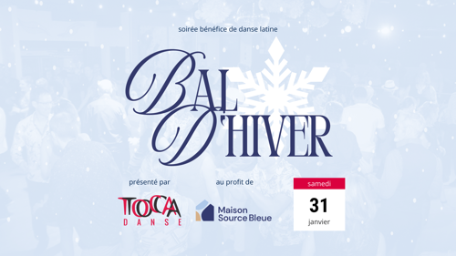Pour une deuxième année consécutive, le Bal d’hiver de Toca Danse, présenté le samedi 31 janvier 2026, aura une mission caritative. Notre école s'engage à amasser des fonds pour la Maison Source Bleue, un pilier des soins palliatifs, en versant 5 $ par billet vendu et en tenant un encan silencieux en janvier prochain.